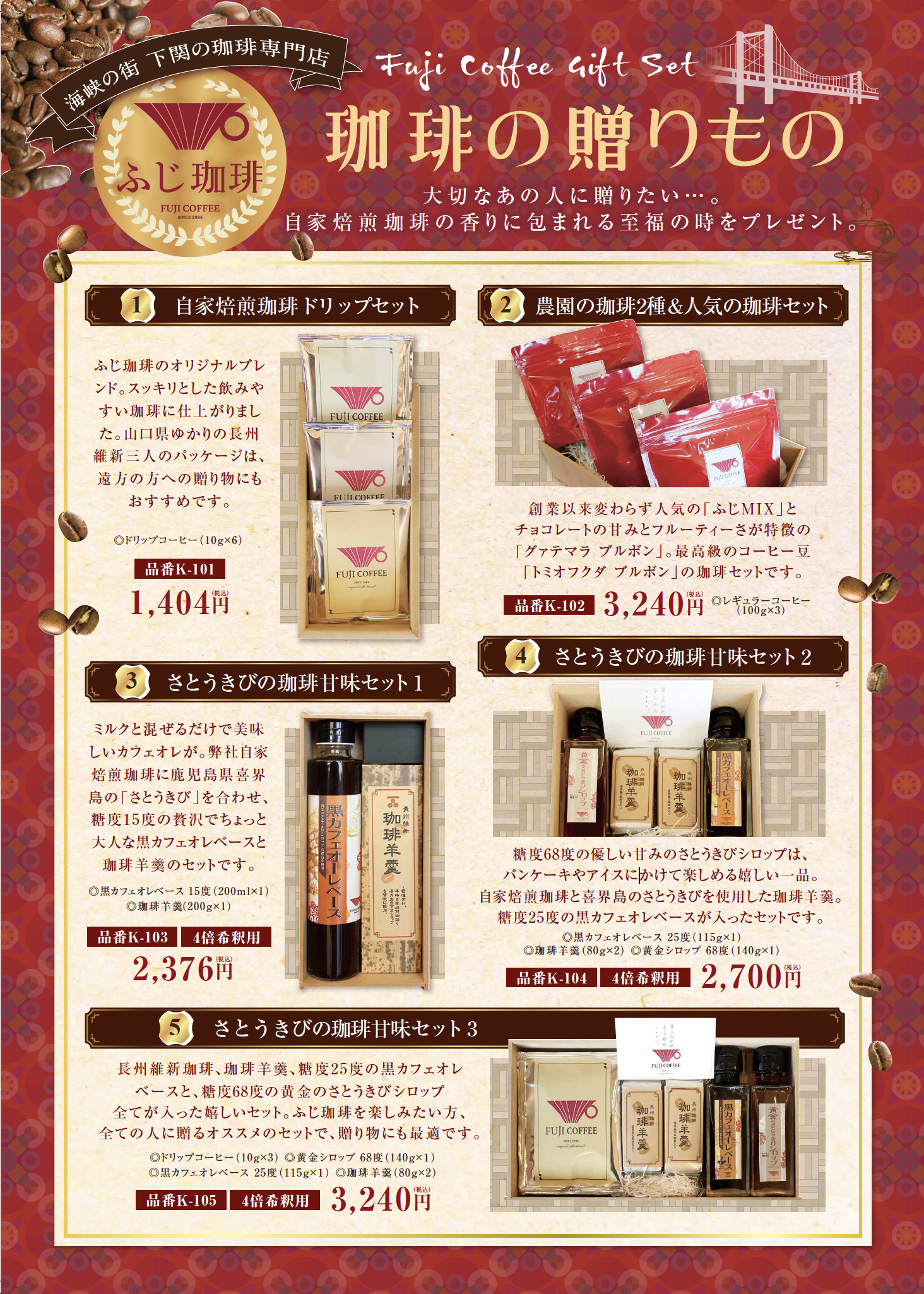 維新のふるさと、山口県下関市が本拠地のふじ珈琲。「本物の味」をつくりだす技と心の想いを胸に出来上がったのが『ふじ珈琲ギフトセット』。
